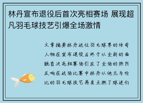 林丹,作为羽毛球界的传奇人物,凭借其卓越的实力与不屈的斗志,已经成为了羽坛历史上最具代表性的选手之一。近年来,尽管退役的消息一度让人感到惋惜,但近日他重返赛场的决定引发了广泛的关注和热议。球迷和专家们纷纷预测,林丹的回归可能将再度为羽毛球界带来一股新的风潮,甚至可能创造更多属于自己的羽坛传奇。在这个...